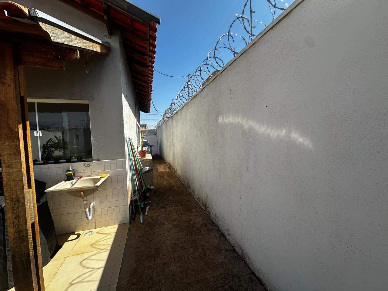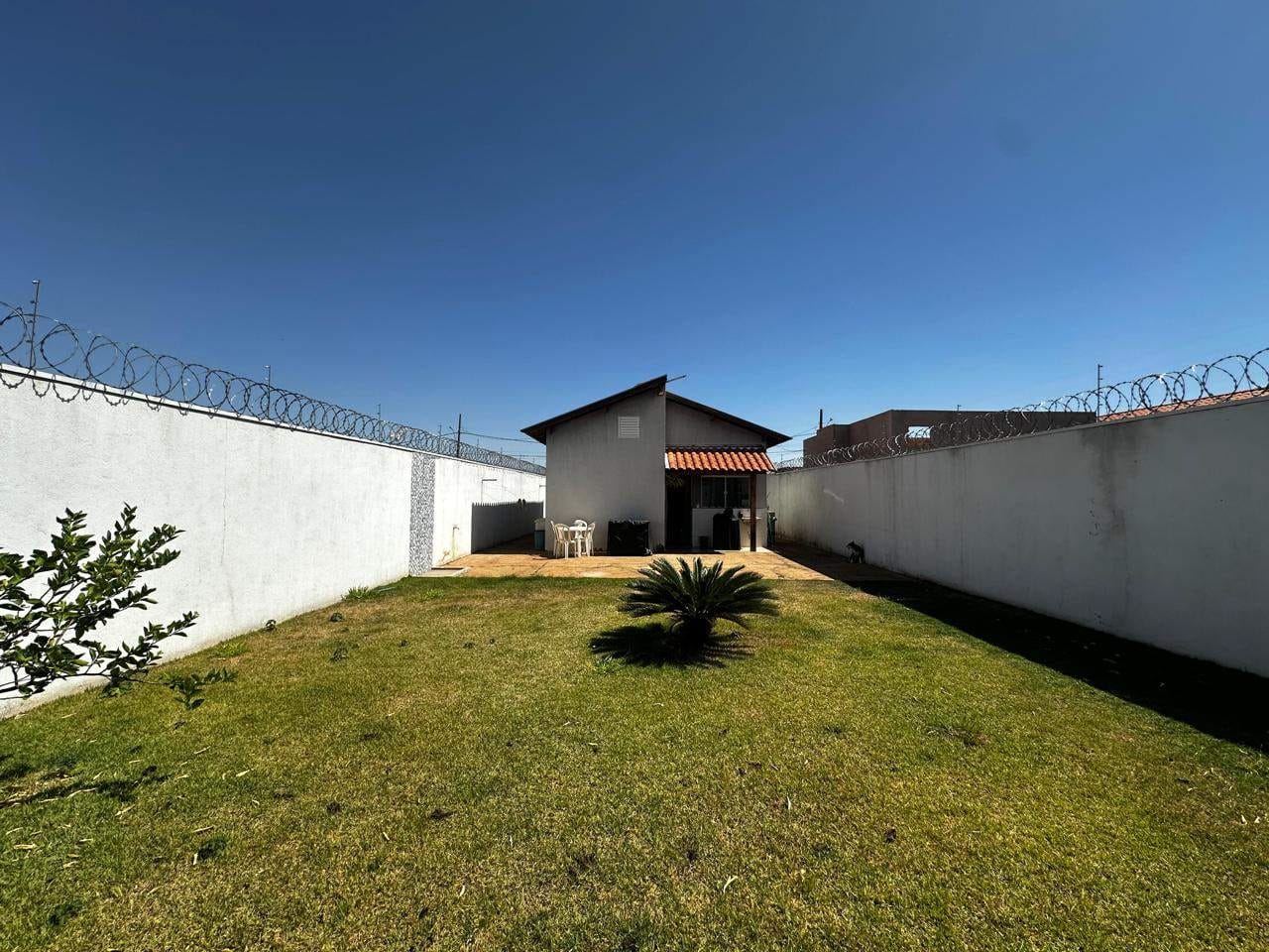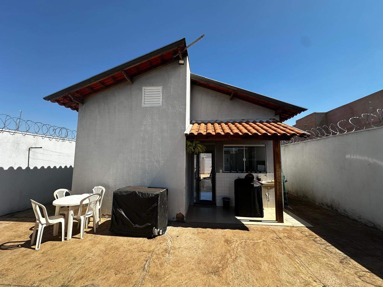 O imóvel está atualmente ocupado por um inquilino, e não é mobiliado. As fotos mostram uma edificação com paredes escuras, portão e cerca elétrica, com um veículo estacionado no pátio externo, que possui chão de concreto. O grande quintal é cercado por muros com arame farpado, com uma área gramada e uma pequena planta. A cozinha é ampla e moderna, com eletrodomésticos em aço inox e bancada de granito preto, com uma janela que proporciona uma vista agradável do exterior.