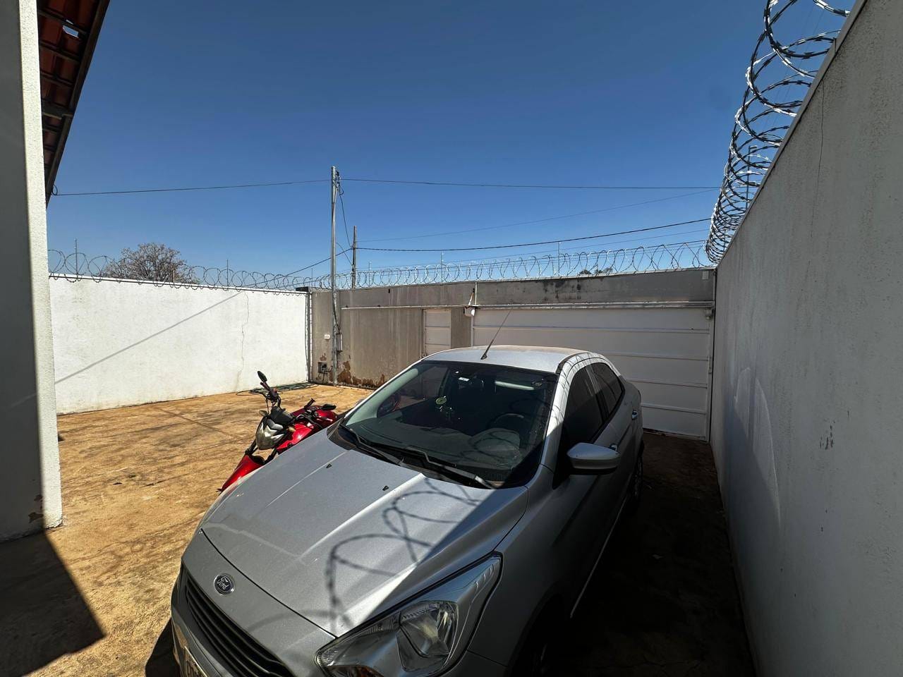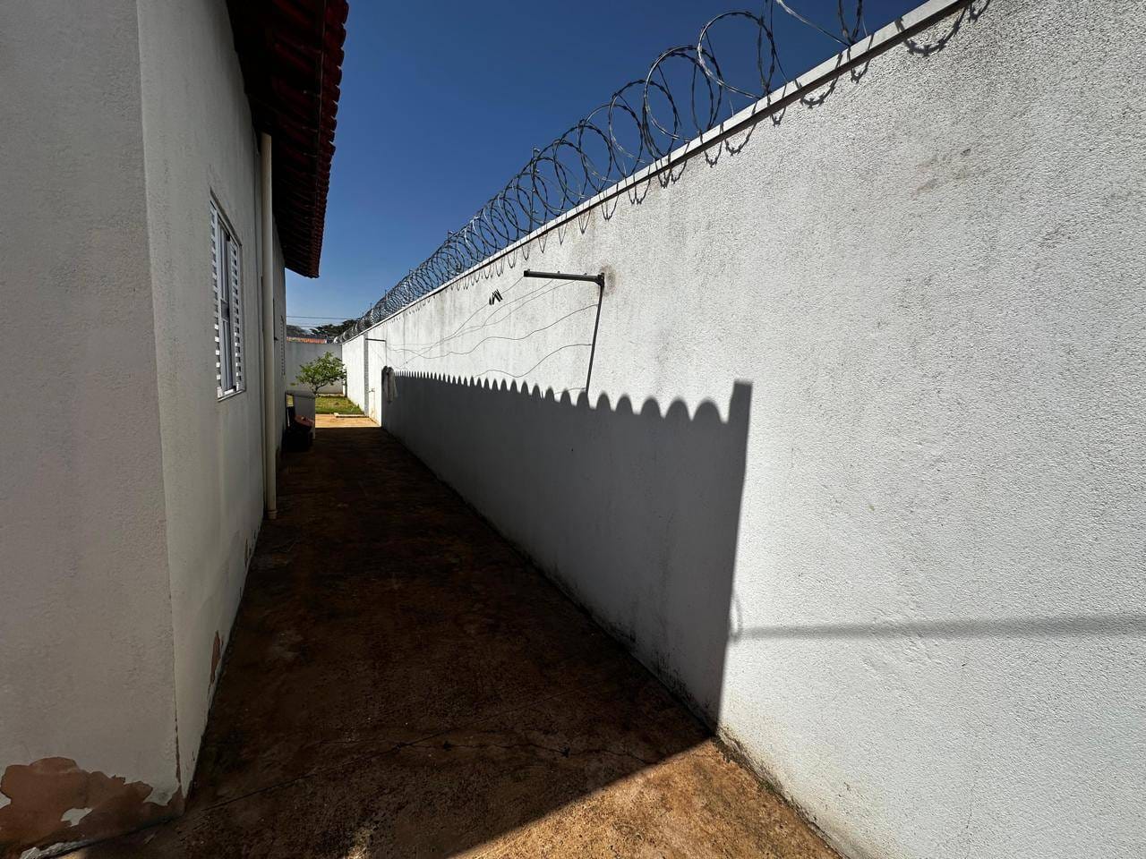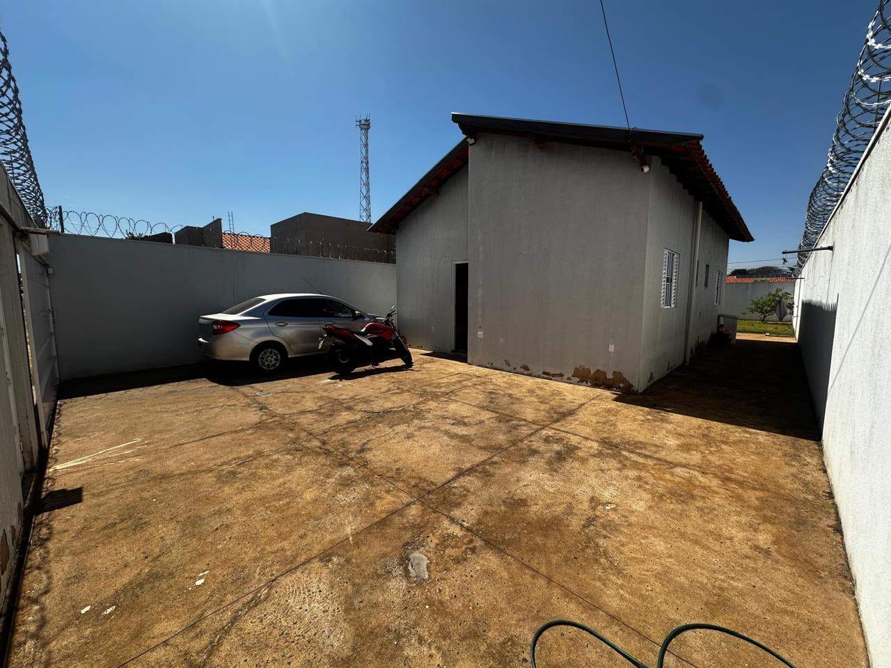 O imóvel está atualmente ocupado por um inquilino, e não é mobiliado. As fotos mostram uma edificação com paredes escuras, portão e cerca elétrica, com um veículo estacionado no pátio externo, que possui chão de concreto. O grande quintal é cercado por muros com arame farpado, com uma área gramada e uma pequena planta. A cozinha é ampla e moderna, com eletrodomésticos em aço inox e bancada de granito preto, com uma janela que proporciona uma vista agradável do exterior.